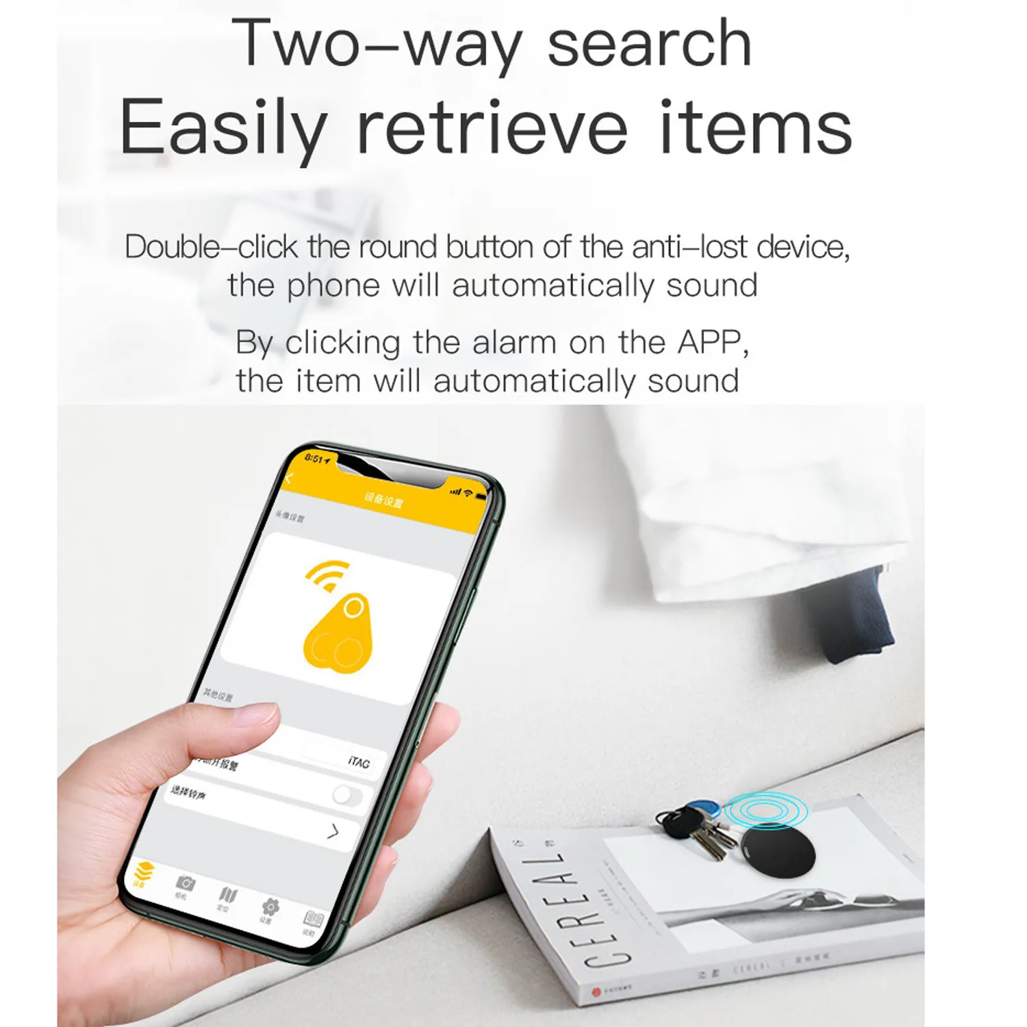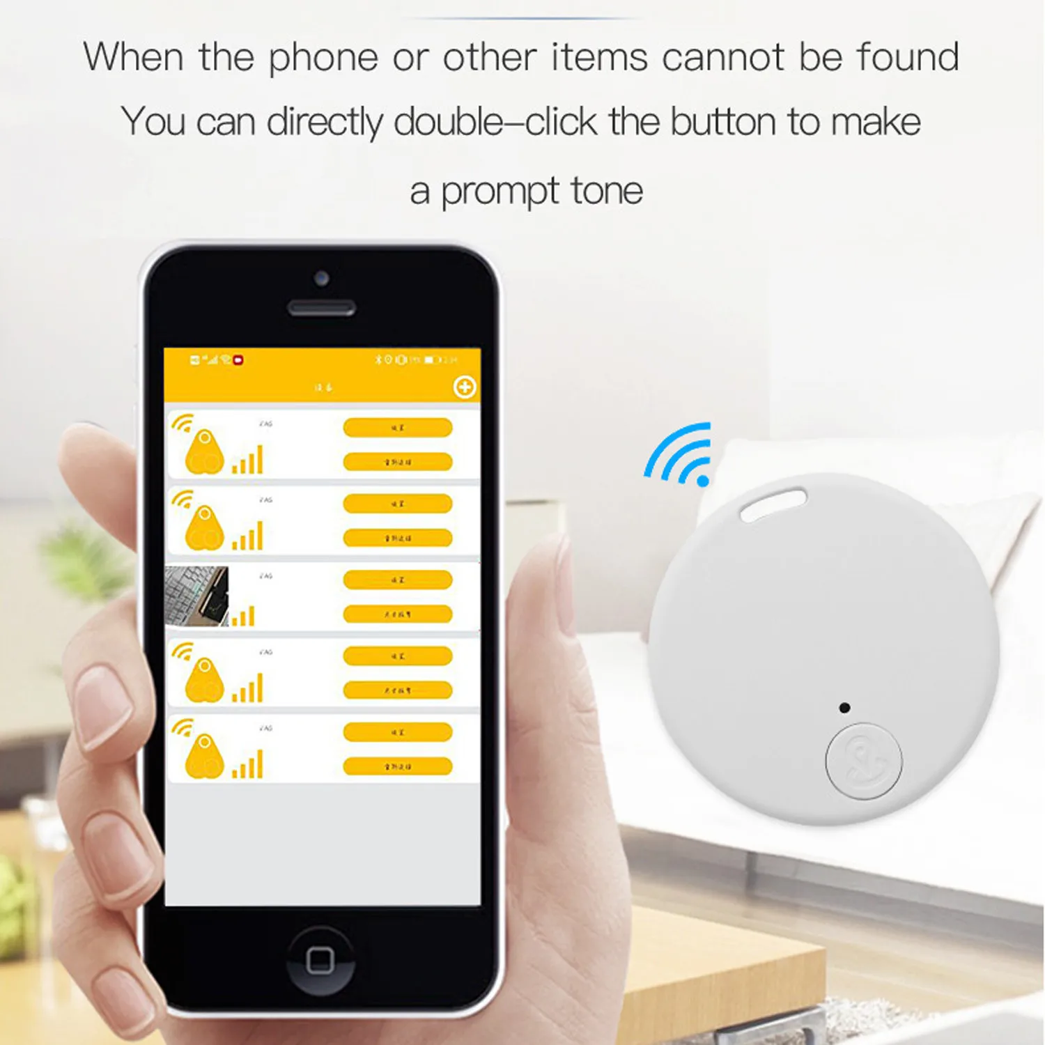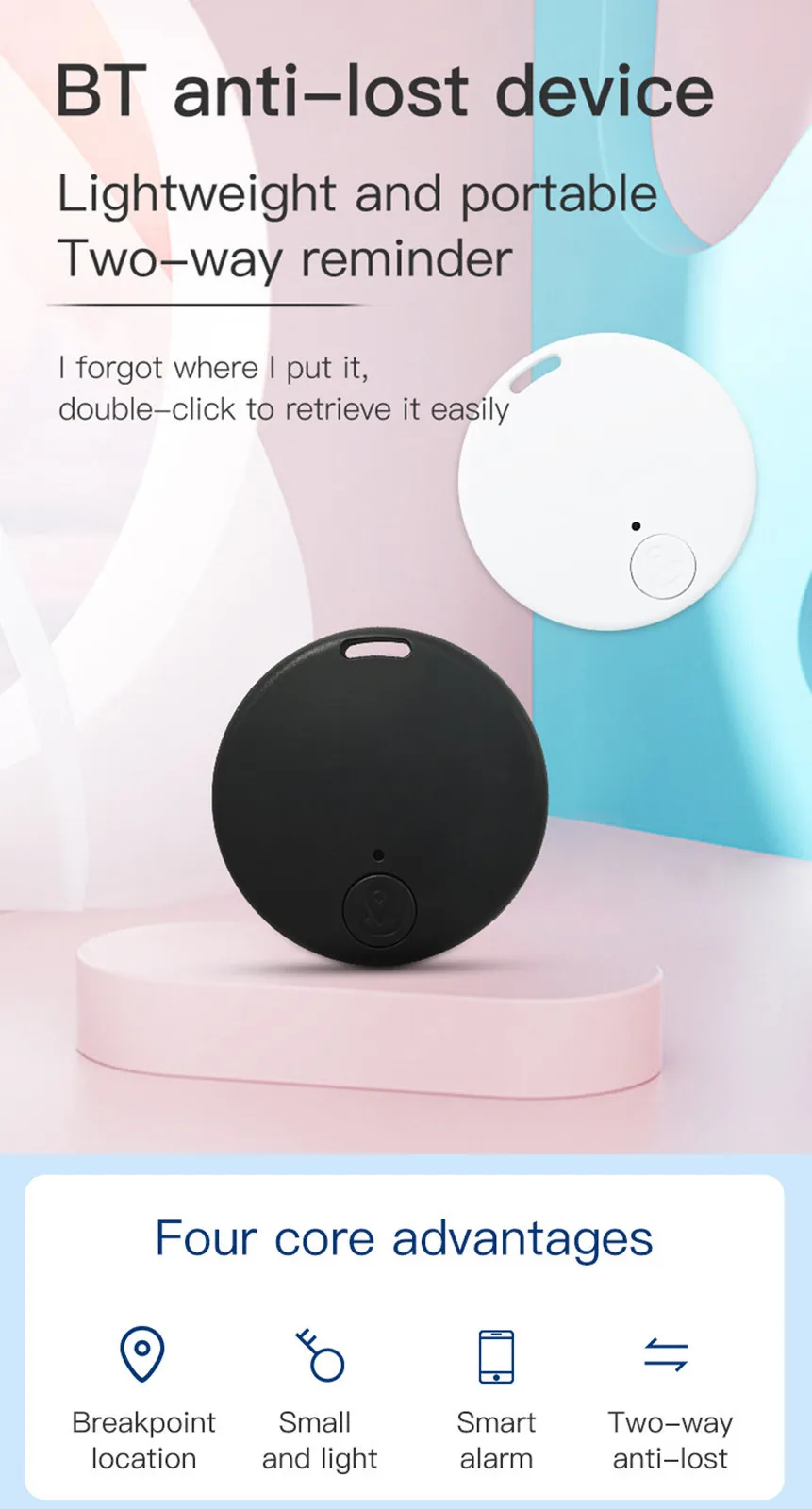 In connection state, when the locator device exceeds the set Bluetooth range, the phone and the locator device will alarm at the same time.(1pc)